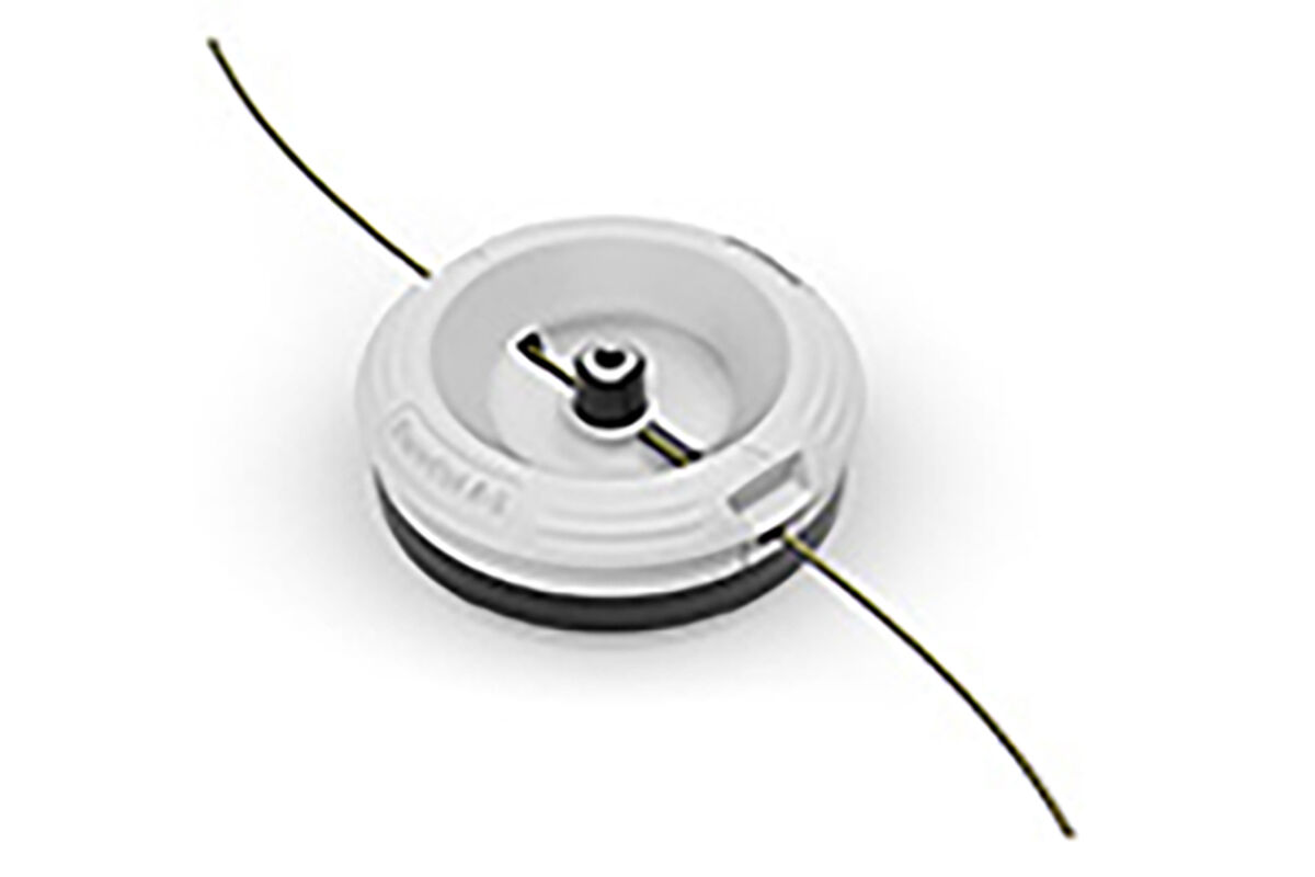 Two-line mower head for area and trimming work in tough grass. Easy insertion of up to 2 pieces of line. Compatible with many different line sizes and shapes.